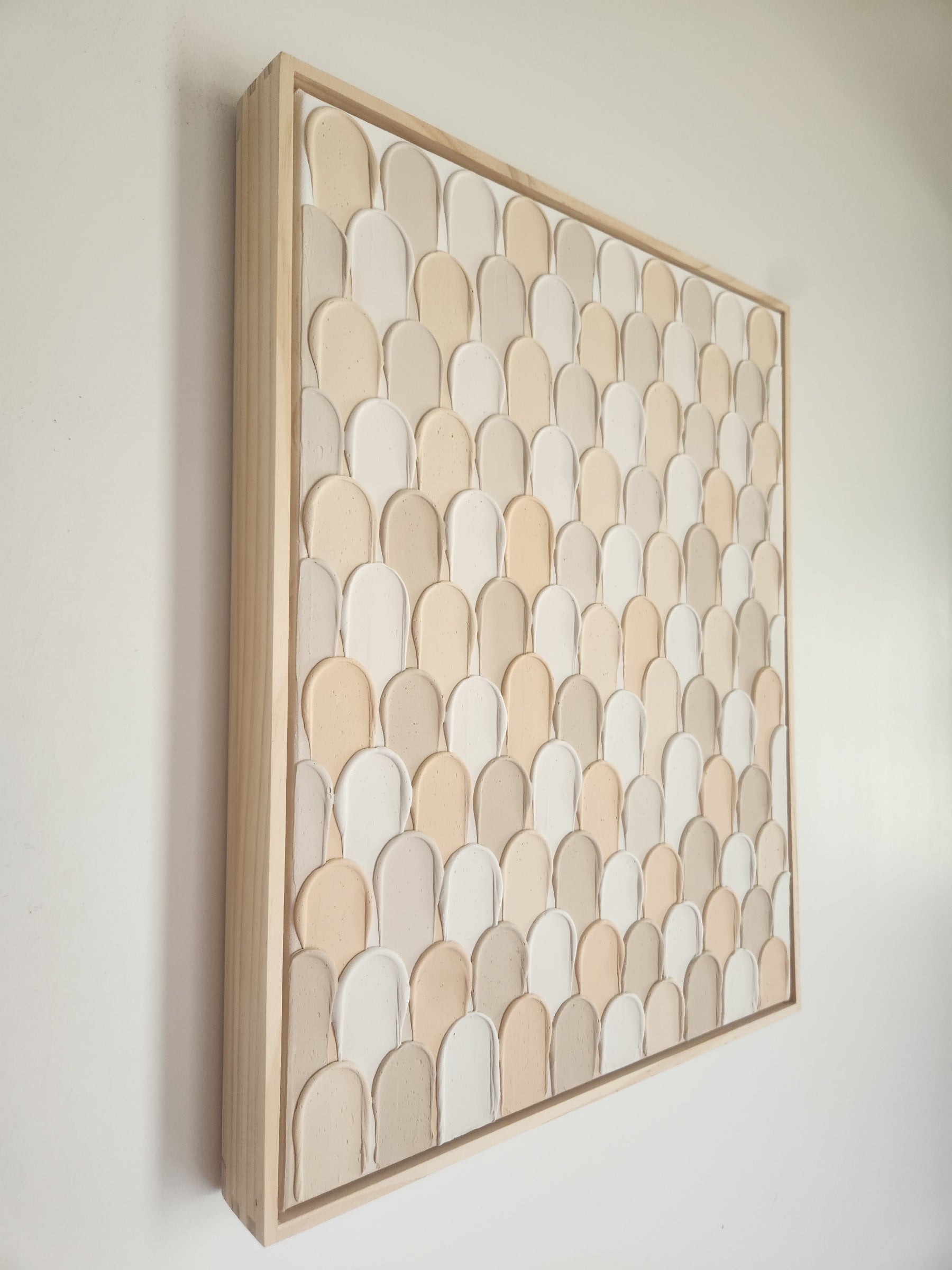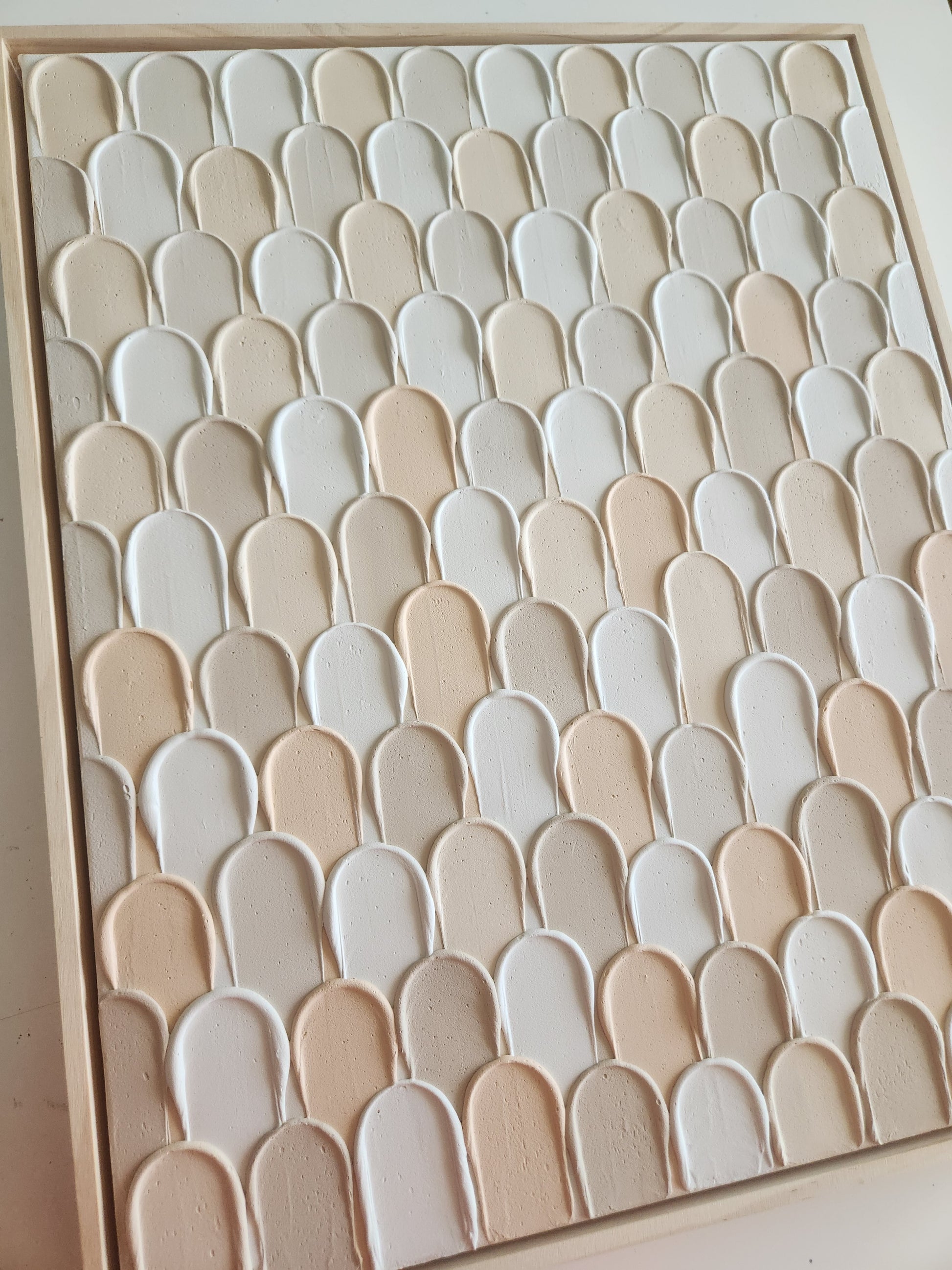 This art piece showcases an abstract texture, capturing the experience of being lost in a bustling crowd. The piece incorporates soft pastel hues of white, beige and peach tones.