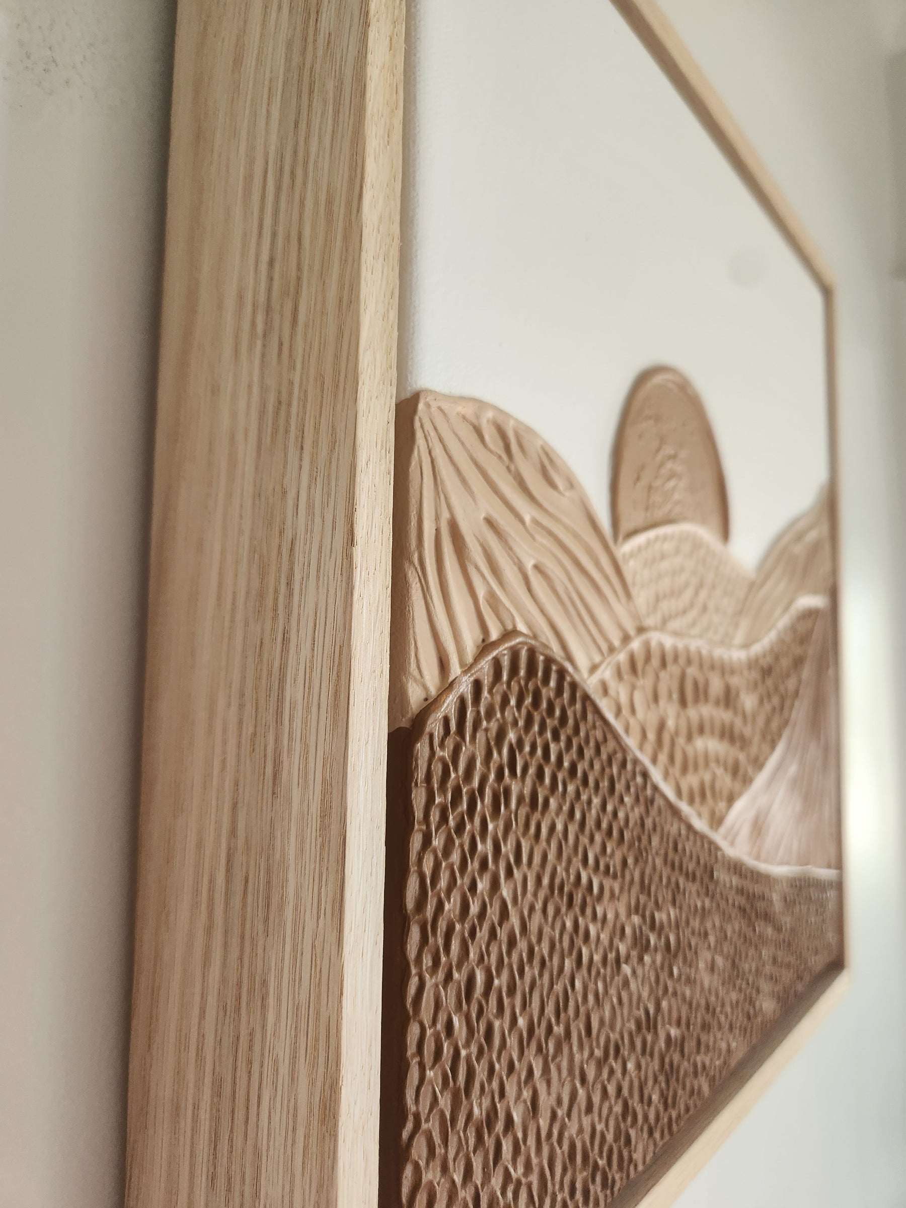 This textured art piece depicts desert dunes with a warm color scheme featuring tans, browns, burnt orange highlighted by a sun.
