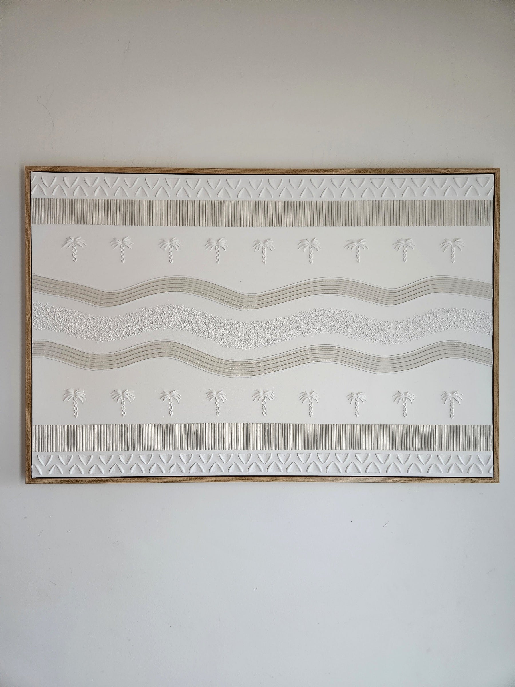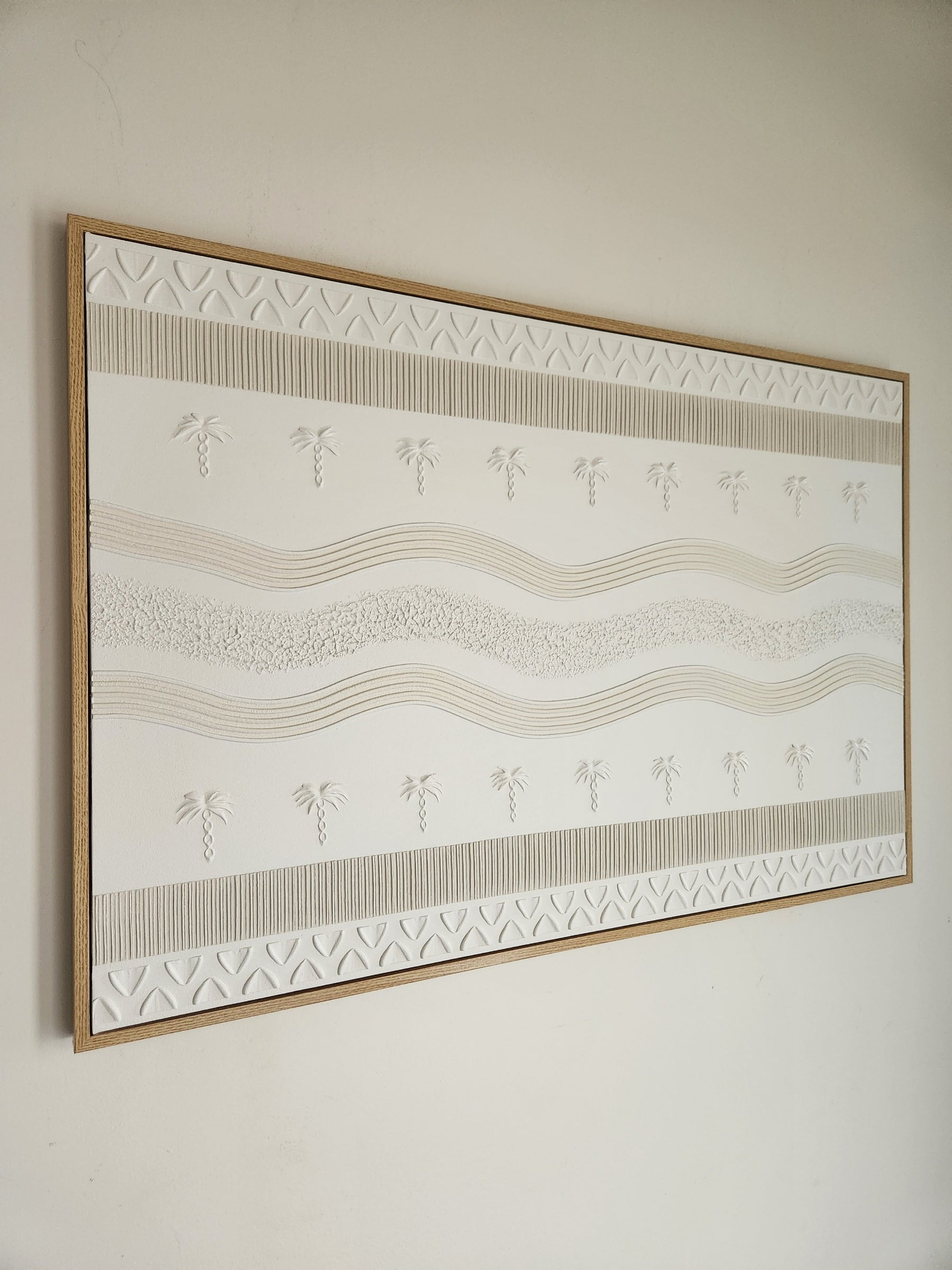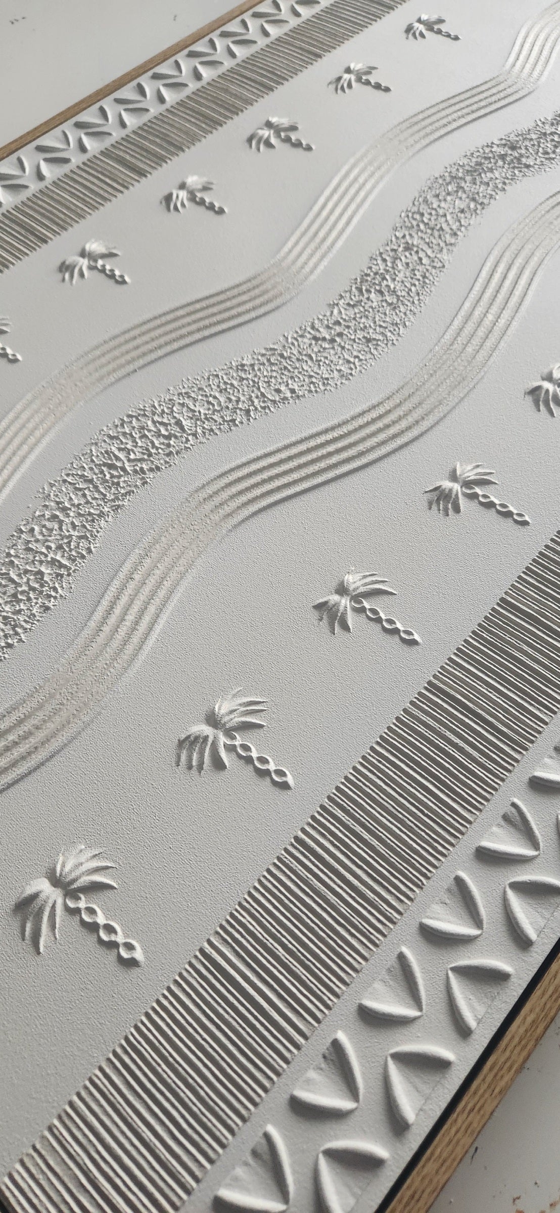This tropical-inspired piece showcases intricate handmade textures with patterns reminiscent of island life and detailed palm tree motifs..